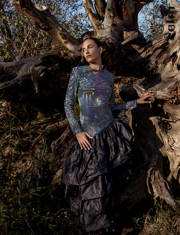 Material: Iridescent, checkered sequins on the top; structured, layered taffeta for the skirt.